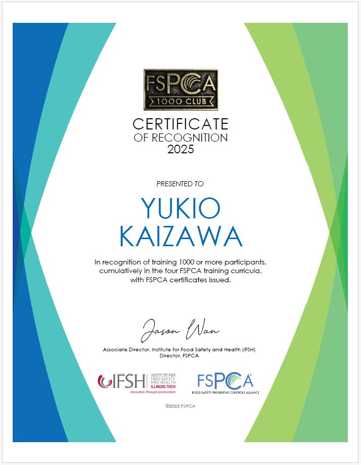 このたび、当社、認定マネージャー/食品安全プログラムマネージャー/審査員として活動する海澤幸生が、米国FSPCA(Food Safety Preventive Controls Alliance)より「FSPCA 1000クラブ」※に表彰されました。